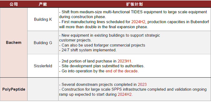 海外生产商处于产能扩张周期,2024H2将有新产能投放。Bachem产能正在切换大批次生产线,公司预计Building K 2024H2投产后Bubendorf产能将至少增加一倍,Sisslerfeld工厂新建产能将在2030年前投产。PolyPeptide全球共有6个GMP生产基地,公司规划大规模固相合成产能在2024H2投产。
