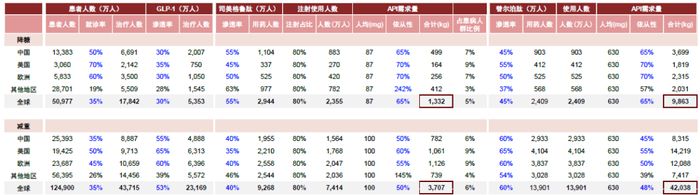 注:降糖患者人群为2型糖尿病(T2DM)患者,减重患者人群为BMI>=30的超重人群;假设患者基数保持稳定