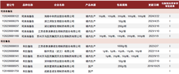 国内GLP-1原料药申报公司数量不超过10家。截至2024年7月,CDE(国家药品监督管理局药品审评中心)司美格鲁肽原料药登记数量为5家,利拉鲁肽为6家。其中,诺泰生物、翰宇药业2个品种均有登记。从包装规格看,诺泰生物量级最大,单规格达吨级,显示出规模化生产优势。