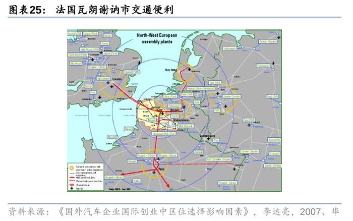 丰田在法国瓦朗谢讷市的选址,同样考虑了这几点要素,地理位置上处于西欧的中心地带,既可以通过英法海底隧道与丰田在英国的工厂相联系,又和丰田在比利时设立的统一领导全欧事务的欧洲经营技术公司总部形成联系;劳动力方面,法国劳动力成本较低,平均工资低于欧洲平均工资5%,瓦朗谢讷市北奥南区更是低于法国全国平均工资,是大部分制造工人的集聚地,劳动力资源丰富;产业集群的角度,瓦朗谢讷市汇集各地大型汽车制造商,包括雷诺、丰田、标志、雪铁龙、菲亚特,零部件工厂众多。