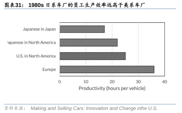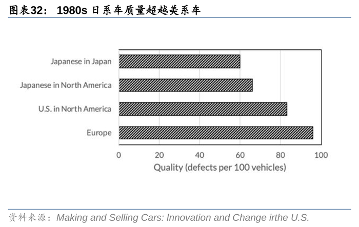 精益生产模式下,丰田为代表的日系车获得了高效率的生产和高质量的产品,成为日系车开拓美国市场的利器。我们对比1980年的日系车和美系车的员工生产销量和汽车质量,在美生产的日系车生产时间低于美系车,而日本生产的日系车更低,同时在美生产的日系车质量缺陷明显低于美系车,与日本国内生产日系车接近。