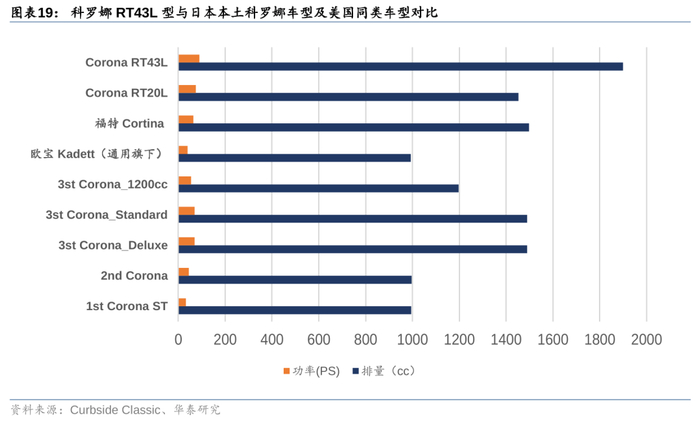 在亚、非等地出口推进的同时,丰田在美国的尝试也仍在继续——丰田吸取皇冠的失败经验,着手根据美国市场消费需求研制新车型,科罗娜RT43L型号选择了带备用动力的1900cc发动机,最大功率达90马力,相比RT20L型的1453cc与75马力有了较大提升,以匹配连续高速行驶需求,也是首款配备自动变速器的美国进口车。