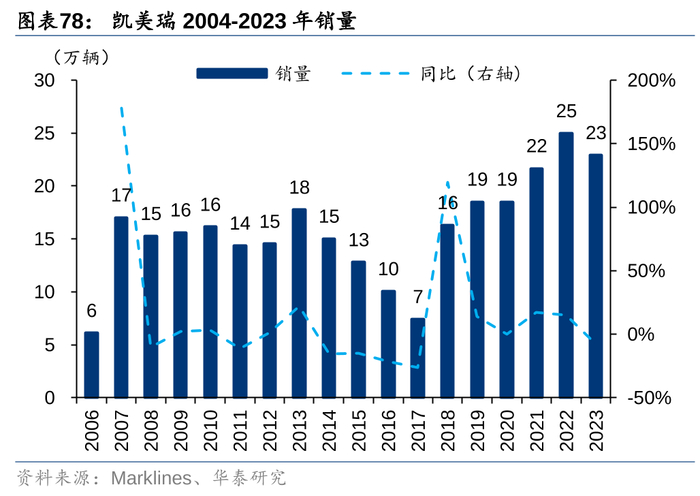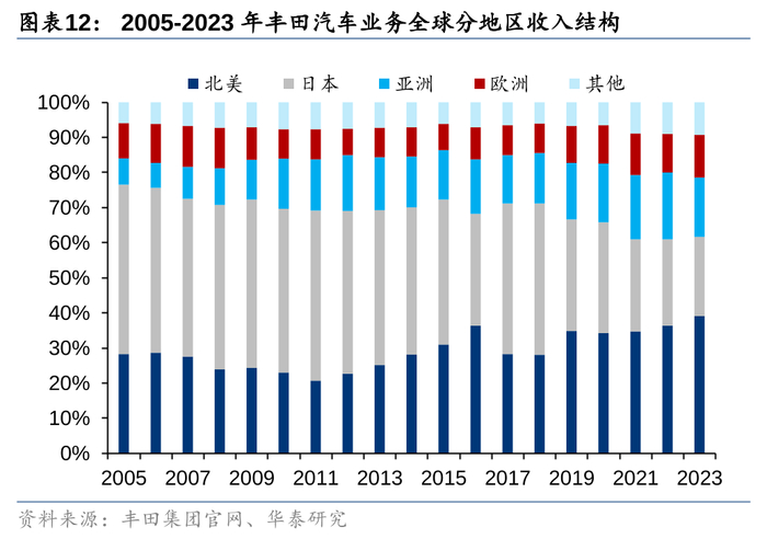 (4)2009年至今:丰田出海业务进入成熟期,公司本土销量占比处在12%-18%区间,出口规模维持在本土市场规模的4-5倍,同时海外市场量价双收,海外市场的收入占比从2008年的42%提升至2023年的77%,海外市场已成为丰田的主要支柱,23年北美需求推动下,丰田总销量创下历史新高。