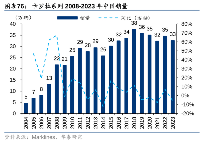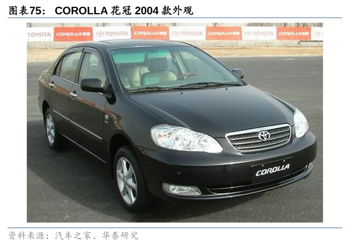 这一市场背景下,丰田引入了家用轿车的明星单品花冠(卡罗拉)。自1966年下线起,这一车型年占据全球销量榜的榜首,证明其对家庭用户的高度适配性。花冠凭借高性价比、低油耗以及优秀的操控特点,在2004年2月在华上市后,迅速成为主流轿车市场上极具竞争力的产品,上市首年即销售5万辆,截至23年底累计销售约560万辆。