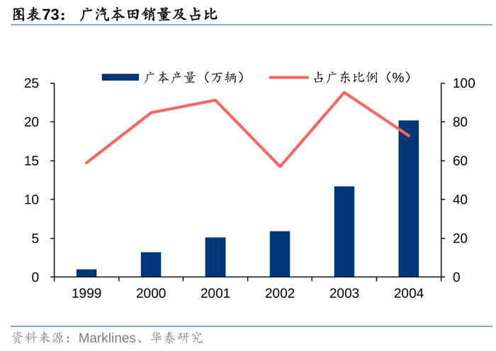 完成北方生产基地建设后,丰田开始寻求第二战线的开拓,将目光聚焦于市场潜力更大的区域市场——1995-2003年间广东GDP产值占据国内GDP超10%,但汽车生产及销量比例仅在1%-3%左右,汽车消费潜力远未释放。另一方面,广汽本田成立后的成功提供了参照,广本销量从1998年的1万辆快速攀升至2003年的11万辆,成长速度惊人。