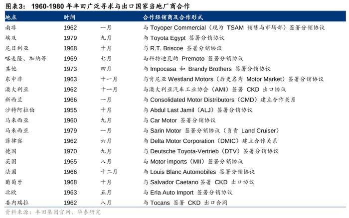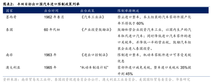 丰田的出海形式则可分为整车出口主导、CKD、合资建厂、独立建厂等阶段,其阶段切换的主要推动力均为目标国家的政策变化。