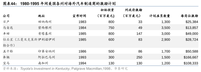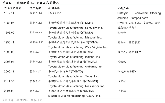 当贸易保护政策倾向出现,CKD等手段仅是阶段性策略,本地化建厂才能真正构建海外竞争力。对出海企业而言:1)合资建厂或帮助公司最快熟悉国情。丰田进入北美时与通用合资建设NUMMI,期间成功引入JIT、团队工作等生产方式,但也遭遇本土供应商零件质量较低、工会介入生产及劳资关系等问题,为自主建厂储备了经验。2)独立建厂时地理位置、劳工成本等都是综合考量要素。丰田美国首个独资工厂落户肯塔基州,正是因当地政府提供1.47亿美元一揽子激励,作为农业州劳动力成本低、工会力量小,且地理位置毗邻美国本土汽车商落址,便于建立整车与零部件间的协同关系。