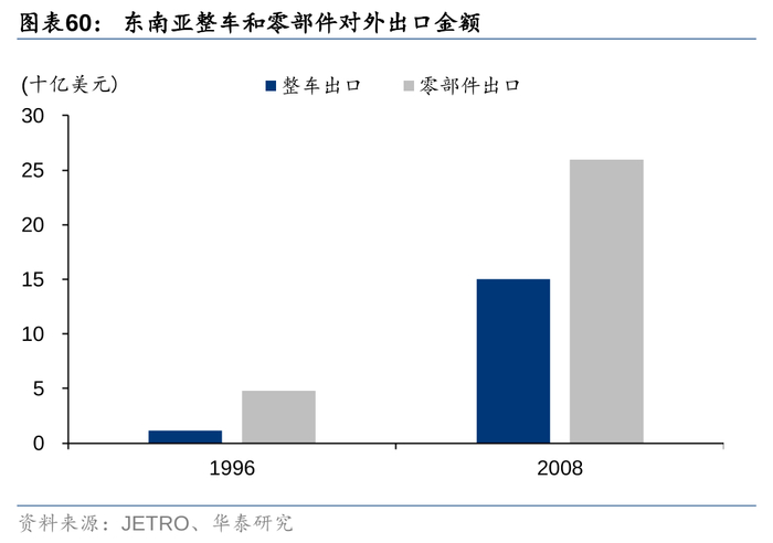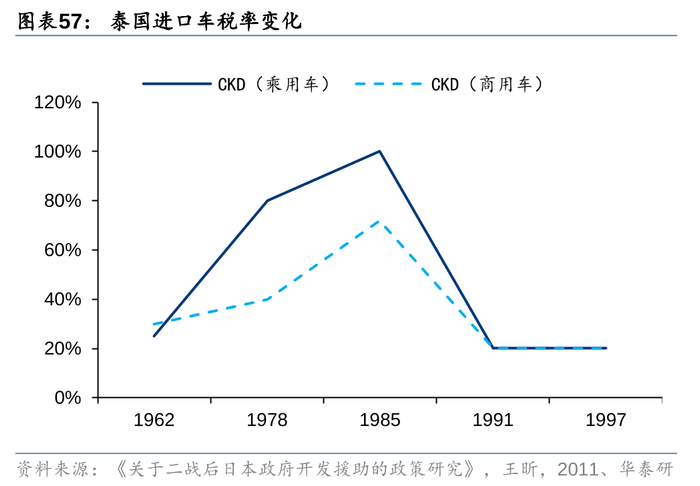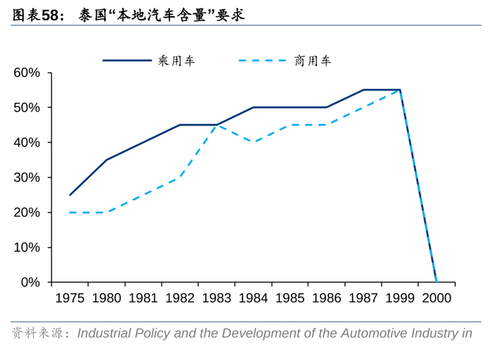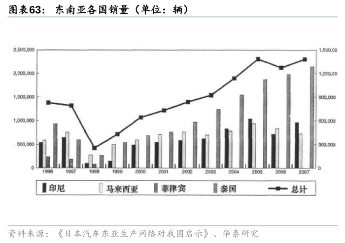 丰田在东南亚出口始于20世纪50年代战后的“赔偿外交”,率先进入投资环境开放、缺乏本土企业的泰国。60年代起泰国政府向“出口导向”发展,采取整车进口关税提高等措施。与欧美企业的退出相反,丰田此时选择与泰国企业合资建立CKD工厂突破限制,通过培育高质量经销商、引入TPS加速本土化进程,1985年在泰市占率达到46%。而在泰国政策背道转向“自由化市场”引入欧美车企后,丰田发力优化生产网络,并建立东南亚区域零部件协调分配机制,打造高效全球化生产基地,向外辐射至澳洲等其他国家。