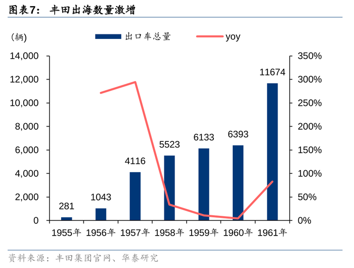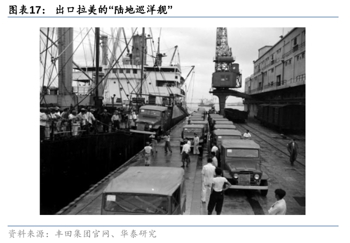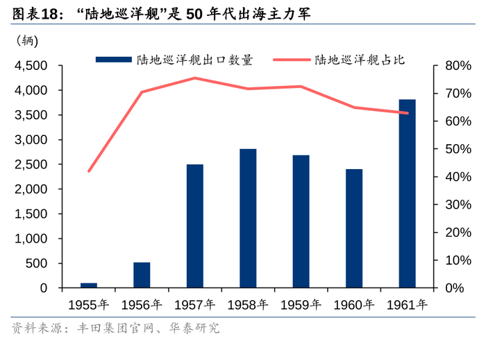 丰田出口最早的成功案例来源于军用延伸的越野车产品,其优良的越野性能为其在拉美和中东等地获得认可,50年代越野车“陆地巡洋舰”出口量占丰田出口的60%以上。