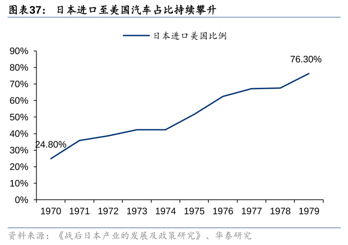 1970-1980年,丰田依靠卡罗拉的优越能耗、性价比,以及日元浮动汇率相对升值的机会,在石油危机油价高涨的背景下,跻身美国第一大汽车进口商,出口北美销量从25万辆增长至76万辆。此时日系车出口美国总量也从31.3万辆提升到177万辆,增长465.5%,占美国进口汽车比例从24.8%提升到76.3%。