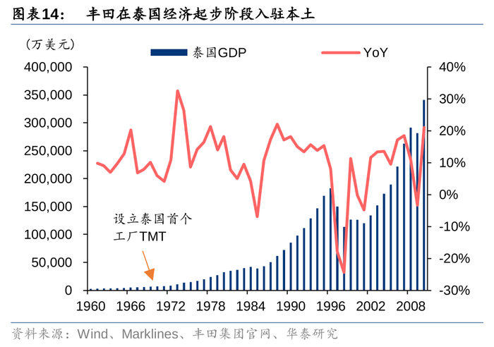 从丰田重点投放资源的出口市场来看,主要分为两类:1)汽车容量庞大的发达国家,如美国。1960-1990年间,美国汽车产量占全球份额基本保持在30%以上,是全球最大的汽车消费市场。对丰田而言,美国是实现全球领先厂商这一目标的必争之地,同时在公司全球化需要大量外汇,以及美国小型车市场起步等因素的催化下,丰田在出海之初就选择将皇冠销往美国,再逐步导入更适销的产品。2)消费潜力巨大且本土厂商式微的新兴国家。丰田在1960年代进入泰国等东南亚国家,除了生产成本的考量因素外,更大程度在于当地经济增长加速,对汽车需求也随之增加。同样地,丰田在1970年代与中国车企开启交流,1990年代进入中国建立合资公司,也正是见证了中国改革开放后的经济腾飞,形成对中国汽车市场存在巨大潜力的判断。