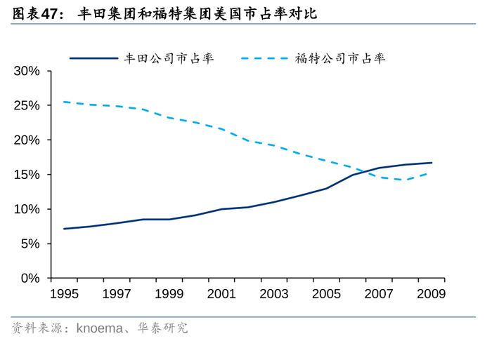 丰田在美崛起先后经历2个关键点:1)把握石油危机机遇,依靠产品优势实现出口腾飞。70年代全球油价高涨,此时丰田凭借着油耗优势显著,且已根据美国高速路况改进的卡罗拉等紧凑型车,出口量从25万辆快速增至76万辆,跻身美国第一进口商。2)贸易摩擦加剧,走向属地化生产。80年代美日贸易摩擦加剧,对日系车发布进口限额。丰田先与通用合资建设NUMMI工厂,积累了生产、用工等经验,进而从肯塔基州开始走向独资工厂。通过“移植”本土供应商完成产业集群建设后,丰田产销快速爬坡,1995-2009年在美销量市占率由7.2%提至16.7%。