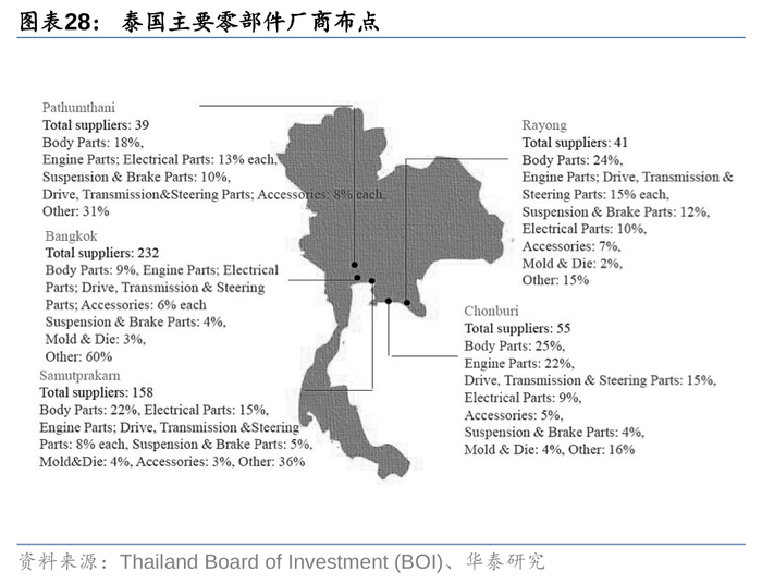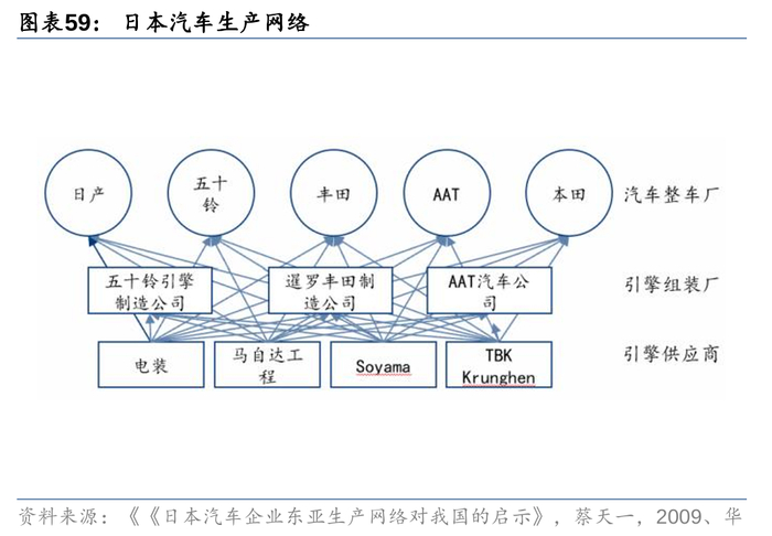 丰田业务向全球开拓后的盈利能力保障正是在于TPS“准时化”“标准化”引入、本地化采购率的提升。在海外工厂建设完成爬坡阶段,构建零部件产业集群对企业至关重要。本国零部件厂商向出口地“移植”,形成产业集群后,有助于企业降低运输成本、关税风险,并提高生产效率。此外,当中国企业集中出口后,也可参考日系车在泰国合作建立零部件采购系统的方式,以减少投资成本,加快达成规模效应。