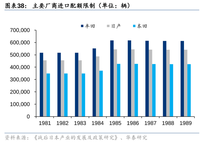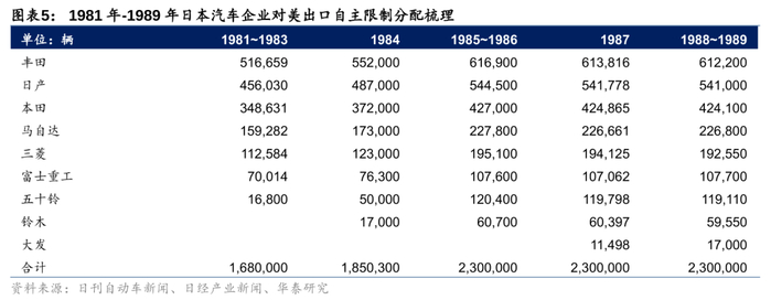 1981年-1983年丰田对美出口自主限制在52万辆,1985-1986年限制在62万辆,1988-1989年限制在61万辆,日系车对美出口在1980年代后期整体限制在230万辆/年。为应对严苛的出口限额措施,同时削弱日元不断升值的压力,丰田开启进行本地化投资生产计划。