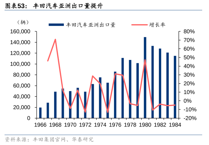 (1)1975年以前:出海业务处于起步期,由于战后五十年代开始日本逐步放开出口限制,丰田的销量规模从50年的492辆增加至61年的1.1万辆,并在保持年均超过15%增速下,出口数量于1966年突破10万辆,初步形成与本土市场同一数量级的销量规模,这一阶段内出口增加的主要贡献来自于亚太和拉丁美洲地区。