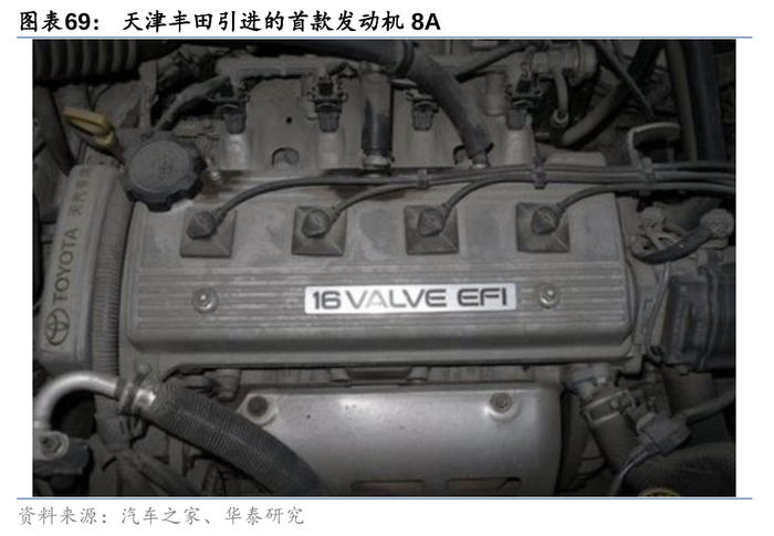 丰田“起跳”阶段的布局开始着眼发动机的本地化生产,1996年5月天津丰田汽车发动机有限公司成立,成为丰田在华主力。合资企业成立后,引进了5条具有世界先进水平的“U”型缸体、发动机缸盖、曲轴、凸轮轴以及连杆机加工生产线、总装线及检测设备。后续丰田向合资公司导入了其专为低端小型车产品序列开发的A型发动机8A,具备动力性较强、低油耗、高耐用的特征,最大功率达到63kW/6000rpm,百公里油耗仅5.0L。合资企业建成后,8A发动机在供应天津夏利的同时,同步向海南马自达、悦达起亚、吉利等外部车企进行销售。