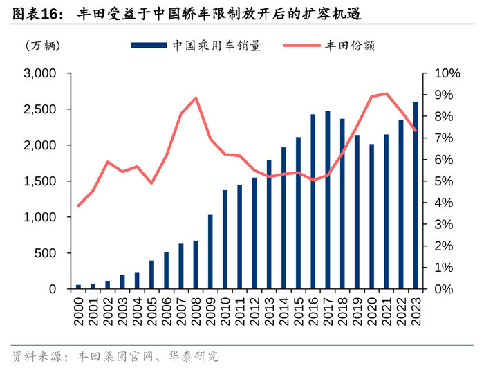 丰田完成不同级别的车型初步布局后,集团战略开始向混动倾斜。但由于混动车在中国缺少足够的政策激励,消费者为“环境保护”支付溢价的意愿尚弱,导致相关产品吸引力不足。新车引进和产能扩充的节奏放缓,加之接连遭遇本土地震、文化冲突等外部因素的影响,2009-2016年间丰田在中国市场的份额出现回落。