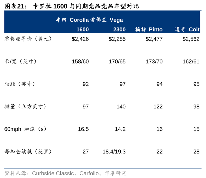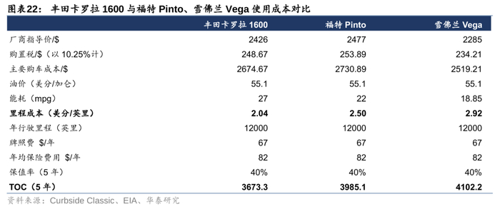 以丰田卡罗拉1600为例,将其与同时期美国市场上同类竞品福特Pinto、雪佛兰Vega的生命周期总成本进行比较。通过假设1)单车生命周期为5年,5年后保值率为40%。2)单车年行驶里程为12000英里。3)牌照费与年保险费用参考加州(1975年)水平,可以发现五年周期内,相比同时期美国本土车系,丰田卡罗拉1600可节约近400到500美元的生命周期成本,每公里油耗分别节省18.5%/30%(对比Pinto和Vega)。