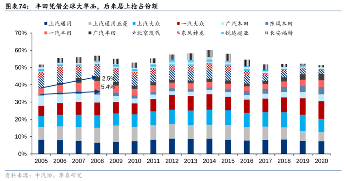 而此时大众、通用则持续加紧重磅新车的推出和本土产能扩充:上汽通用在2008年/2014年增设沈阳金盛工厂二期/三期工厂,扩充20/25万辆产能,大众则于2013年投入佛山工厂,作为撼动日系在东南市场垄断地位的重要一步。产品方面则分别为中国重新设计了迈锐宝、帕萨特等重磅车型,并通过双离合变速箱等先进动力系统技术对丰田、本田占据优势的中型车市场形成冲击,成功抢占部分日系份额。