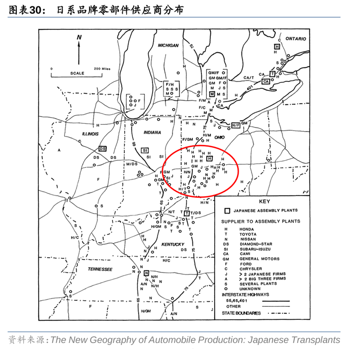 由于在日系车在美国乘用车市场份额扩张的过程中,一大部分日本零部件厂商已紧跟车企步伐,在临近底特律的东北及中西部地区落地。若丰田选择沿用西海岸NUMMI工厂的空余产能,尽管便于继续从日本本土进口配套零部件,但势必将削弱本地化生产所具备的成本竞争优势。而肯塔基州地处中心位置,可通向中西部上游的产业集群,交通、市场条件良好,斯科特县更位于"金三角 "内,具备较强区位优势,有利于丰田缩减零部件物流运输成本。