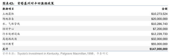 以公司在北美工厂选址为例,丰田将首个自主工厂落址于肯塔基州,综合考虑:1)地理位置:肯塔基州地处中心位置,距离底特律附近的日本零部件厂商聚集地较近,区位优势强,利于构建集群效应;2)劳动力成本:肯塔基州平均薪资较临近州更低,且工会介入力量小;3)政府激励措施:肯塔基州产业结构以农业为主,州政府转型意愿强烈,为此向丰田入驻提供了1.47亿美元激励政策扶持。