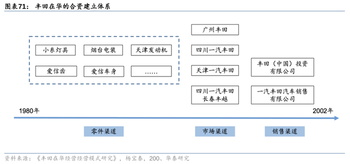 20世纪80年代中国本地化率阶梯式税收优惠政策出台,90年代放开个人购买轿车限制,成为丰田进入中国的核心原因。决心进入中国后,丰田海外负责人奥田硕因地制宜设下“三级跳”的发展战略,战略执行者服部悦雄积极协调政企关系,公司从易到难先后完成一般零部件合资、发动机合资,并在完成本地化准备后,与“三小”之一的天汽合资,在中国立定脚跟。其后丰田主动斡旋推动一汽重组,完成从小排量到豪华车的全产品布局,利用本土资源将品牌网络扩至更多北方地区。并选择已有本田入驻的广州完成自身的南方布点,最大化日系产业集群效应,树立合资公司典范。