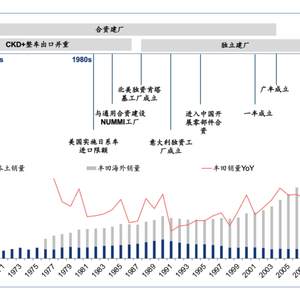 丰田的全球化发展由20世纪50-60年代起步,丰田在恢复对外出口后凭借越野车开辟中东市场,出口销量在6年时间内从281辆增至1.2万辆;60-80年代,丰田的出口国家开始实施管制,丰田以CKD(Completely Knock Down散件出口)形式规避的同时,以石油危机为契机,向美国市场输出卡罗拉等车型,在70年代后期成功跻身美国销量前四汽车品牌;80-90年代,日系车热销引发美日贸易摩擦,丰田先后尝试合资及独立建厂完成本土制造目标;进入21世纪,公司基于北美的成功经验,迅速开展全球投资,向东南亚与西亚、欧洲、中国、拉美中东等地先后投资开设工厂,实现了从单一市场向全球扩张。