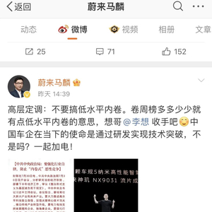 7月30日,蔚来品牌与传播助理副总裁马麟在微博直接发文@了理想汽车CEO李想的个人微博账号称:“高层定调,不要搞低水平内卷。卷周榜多多少少就有点低水平内卷的意思,想哥@李想收手吧。中国车企在当下的使命是通过研发实现技术突破,不是吗?一起加电!”