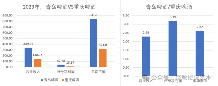 青岛啤酒体量要比重庆啤酒大不少,青岛啤酒的营业收入、归母净利润和2023年平均市值分别是重庆啤酒的2.29、3.19和2.16倍。