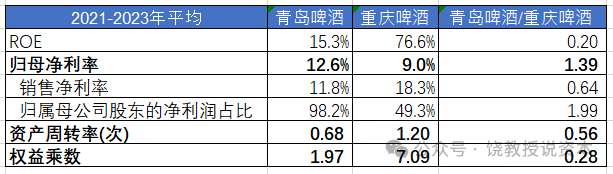 在对比同行时,一个指标吸引了我,青岛啤酒2023年ROE是16.1%,两位数,不错,对比重庆啤酒2023年ROE高达63.7%,差了4倍,为什么?引发我的好奇。