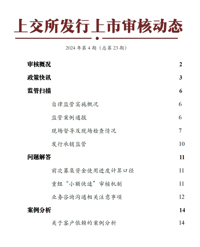 《上交所发行上市审核动态》立足于回应市场关切,解决具体问题,明确政策和监管要求,在内容编制上包括审核总体情况、重要法规政策解读、监管要求和案例等,同时将审核实践中总结的具有共性和代表性的审核关注重点问题以及典型个案进行评析后反馈市场。审核动态内容根据市场需求,不定期调整完善。