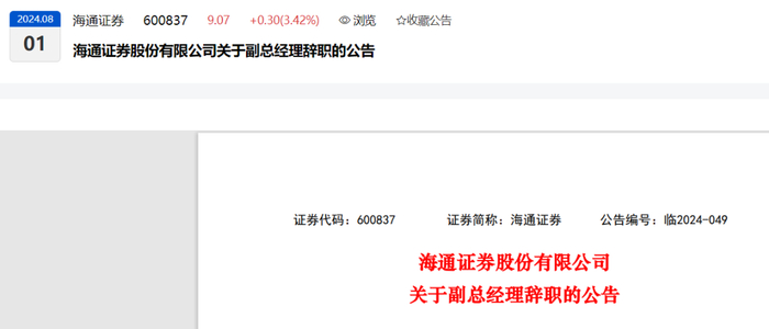 2024-08-01海通证券:海通证券股份有限公司关于副总经理辞职的公告