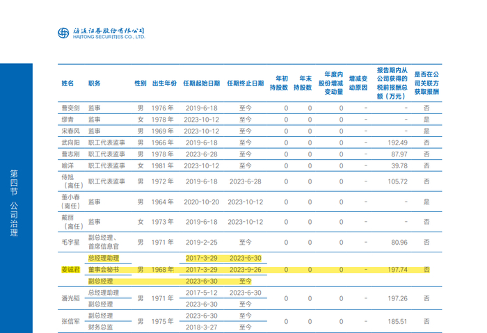 姜诚君1968年出生,经济学硕士,经济师。姜先生自 2023 年 6 月 30 日起担任公司副总经理。姜先生自 1993 年 7 月至 1994 年 7月担任厦门国贸集团股份有限公司干部;1994 年 7 月至 2000 年 8 月先后担任厦门国泰企业股份有限公司金融证券部副经理、投资管理与发展部经理、总经理助理、董事会秘书、副总经理;2000 年 8 月至 2023 年 3 月在公司投资银行部、投资银行总部工作,先后担任投资银行部副总经理、投资银行部副总经理(主持工作)、投资银行部总经理、投资银行总部总经理;2017年 3 月至 2023 年 6 月担任公司总经理助理,2017 年4 月至 2023 年 7 月担任公司联席公司秘书、联席授权代表,2017 年 3月至 2023 年 9 月担任公司董事会秘书。