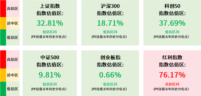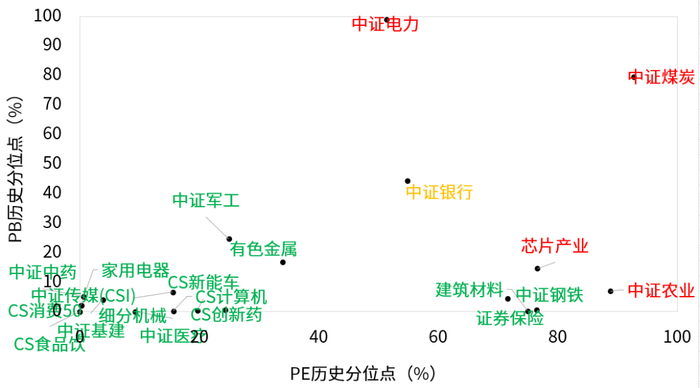 点阵图阅读指南:绿色代表指数位于低估区间,黄色代表指数位于适中区间,红色代表指数位于高估区间。周期类行业可参考PB历史分位点为主,消费及科技类行业可参考PE历史分位点为主。仅供参考,不作为投资建议。