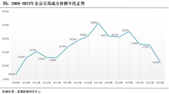 但近年来多地居住体验感较差的公寓价格明显下滑。以北京为例,据诸葛找房数据研究中心统计,北京商住公寓成交均价曾于2017年来到顶峰,达35668元/平方米。而2023年的成交均价仅为21366元/平方米,比2010年时的均价都低。