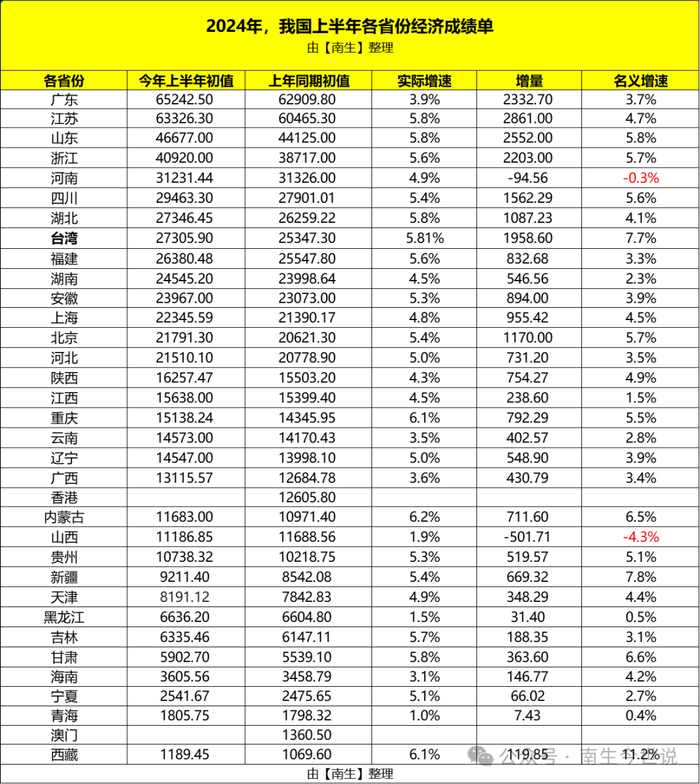 与湖北省的27346.45亿元相比,差距拉近至41亿元了。差距如此之小,湖北省下半年若不加把力,2024年全年的经济规模很有可能要被台湾赶超了——这是今后几个月值得重点关注的话题。