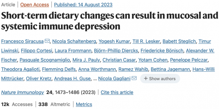 此前,一项来自德国汉堡-埃彭多夫大学医学中心研究团队,发布于Nature Immunology上的研究揭示:从富含膳食纤维的平日饮食切换到高能量浓度的“盛宴”,每一次的短暂转变都会改变胃肠道的代谢、转录和免疫学格局。简单来说:每一次的大餐都是以短时免疫抑制为代价的!