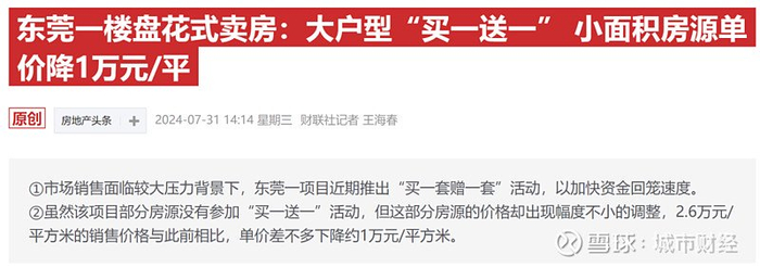 据财联社报道,该“买一套送一套”的项目,位于东莞主城万江街道,购买东莞该项目参与活动的房源,可获赠由其开发的位于惠州另一个楼盘的一套公寓房,但本次“买一送一”仅限于140平方米以上大户型房源。