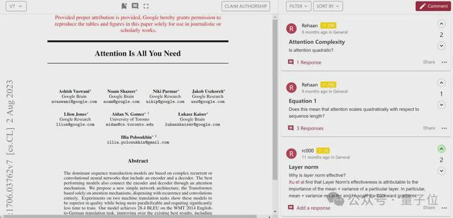 比如打开AI领域经典之作《Attention is All You Need》,可以看到有很多人已经留下了评论。