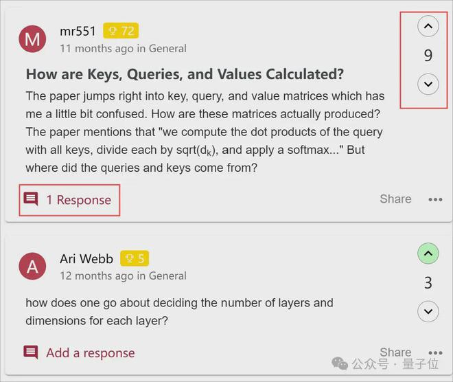 由此读者们就能针对很多细节提问,比如,“如何决定层数和每层的尺寸?”、“这篇论文直接跳到键、查询和值矩阵,这让我有点困惑”……