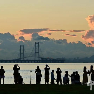市民游客在翠亨新区海边观看日出,远处就是雄伟的深中大桥。记者 缪晓剑 摄