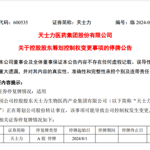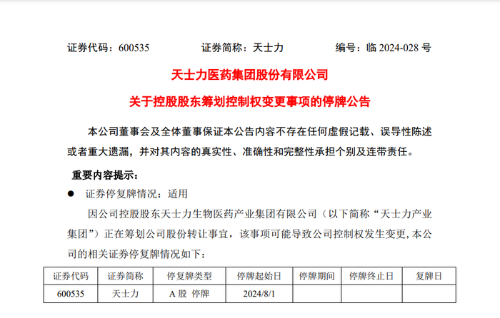 灯塔媒介8月1日讯,天士力(600535),中药行业的领头羊,7月31日晚发布公告,因控股股东天士力生物医药产业集团有限公司(以下简称“天士力产业集团”)筹划股份转让可能导致控制权变更,公司股票自8月1日起停牌,预计停牌时间不超过两个交易日。