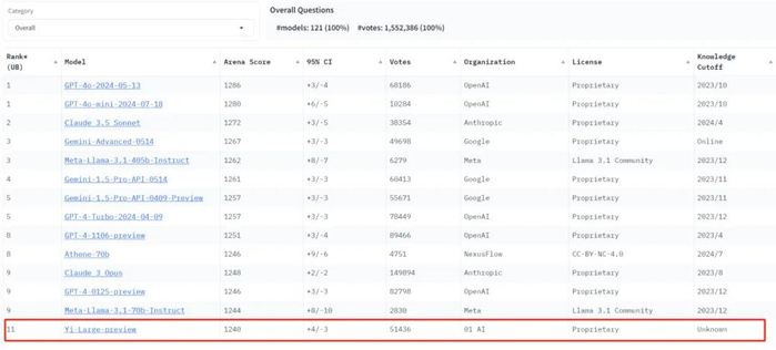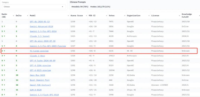 在 LMSYS 盲测竞技场最新排名中,零一万物的最新千亿参数模型 Yi-Large 总榜排名世界模型第14(刚发布时排名世界模型第 7),中国大模型中第1,排于其前面的仅有OpenAI、Anthropic、Google、Meta、NexusFlow的大模型;其中文分榜排名第7位(刚发布时排名世界模型第1)。