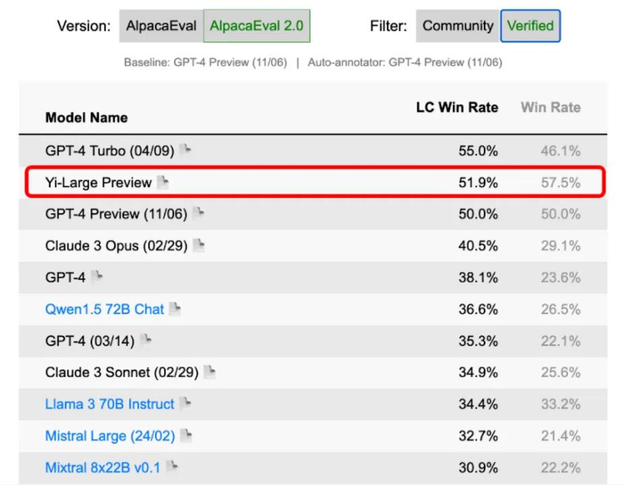 在2024年5月评测斯坦福评测机构 AlpacaEval 2.0模型排行榜中,零一万物 Yi 模型在全球头部大模型的中英文双语 PK 上表现出色。