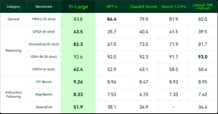 在更全面的大模型综合能力评测中,Yi-Large多数指标超越 GPT4、Claude3、Google Gemini 1.5 等当时同级模型。