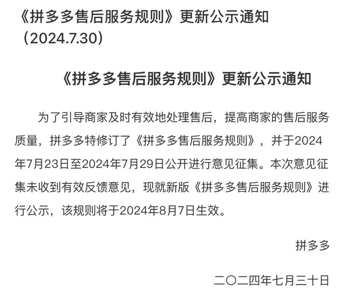 而据接近拼多多的人士透露,这次售后服务规则公示更新,是平台一个正常的更新调整,并非在其他方面影响下做出的调整。