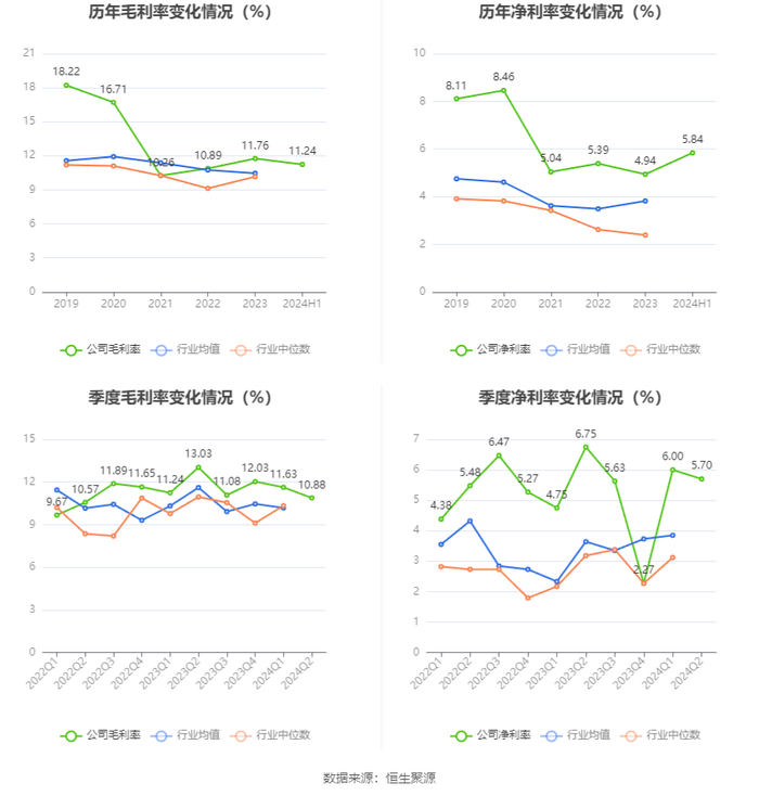 2024年上半年,公司毛利率为11.24%,同比下降0.86个百分点;净利率为5.84%,较上年同期上升0.13个百分点。从单季度指标来看,2024年第二季度公司毛利率为10.88%,同比下降2.15个百分点,环比下降0.75个百分点;净利率为5.70%,较上年同期下降1.05个百分点,较上一季度下降0.30个百分点。