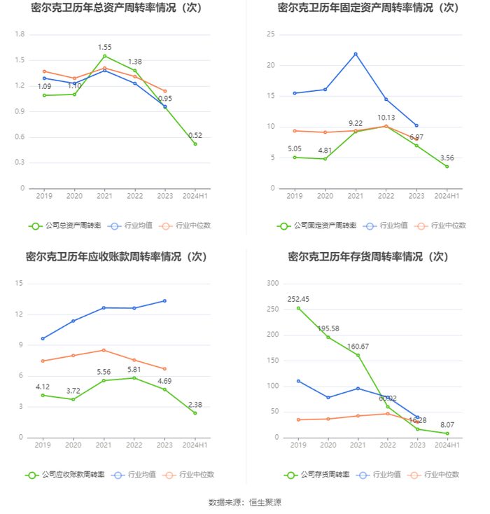 营运能力方面,2024年上半年,公司公司总资产周转率为0.52次,上年同期为0.47次(2023年上半年行业平均值为0.46次,公司位居同行业26/45);固定资产周转率为3.56次,上年同期为3.62次(2023年上半年行业平均值为5.31次,公司位居同行业24/45);公司应收账款周转率、存货周转率分别为2.38次、8.07次。