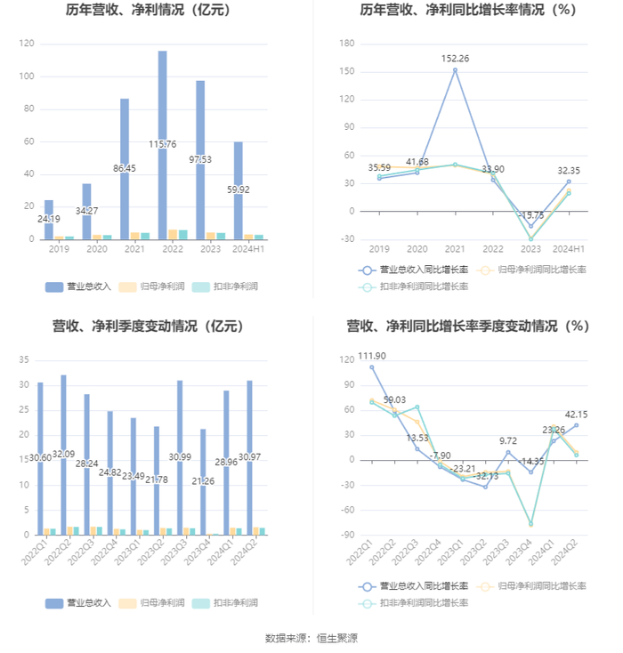 根据半年报,公司第二季度实现营业总收入30.97亿元,同比增长42.15%,环比增长6.93%;归母净利润1.6亿元,同比增长9.58%,环比增长5.86%;扣非净利润1.47亿元,同比增长6.18%,环比增长4.63% 。