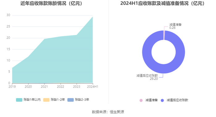 从应收账款账龄结构来看,截至2024年上半年末,公司账龄在1年以内的应收账款余额为29.25亿元,较上年末增长8.08亿元,占应收账款总额比例为99.27%,较上年末上升0.08个百分点。